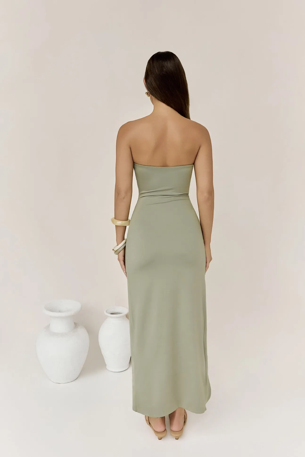 The Heading Out Strapless Midi Dress in Olive is the ultimate cocktail statement piece. Featuring an elegant strapless design, this dress is elevated by stunning stone-wired detailing across the top of the bust, adding a unique and glamorous touch. The daring leg slit and flattering ruched side detailing create a silhouette that’s both bold and sophisticated. Perfect for cocktail parties or evening events, this head-turning midi dress will have you feeling confident, chic, and ready to steal the spotlight.
