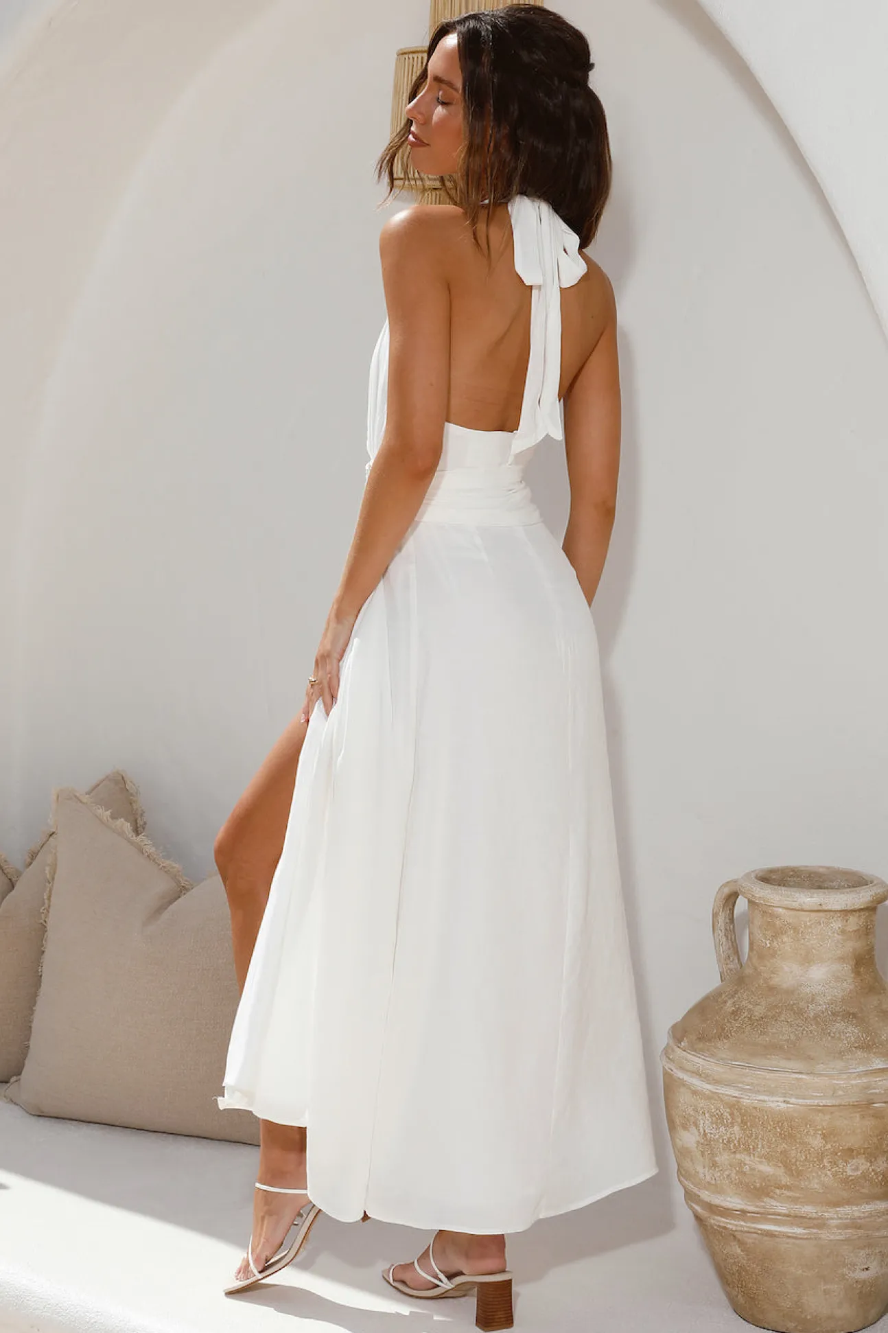 Experience the culture of Athens in the Heaven Can Wait Maxi Dress in White. This dress pairs well with beige sandals and matching gold adornments.