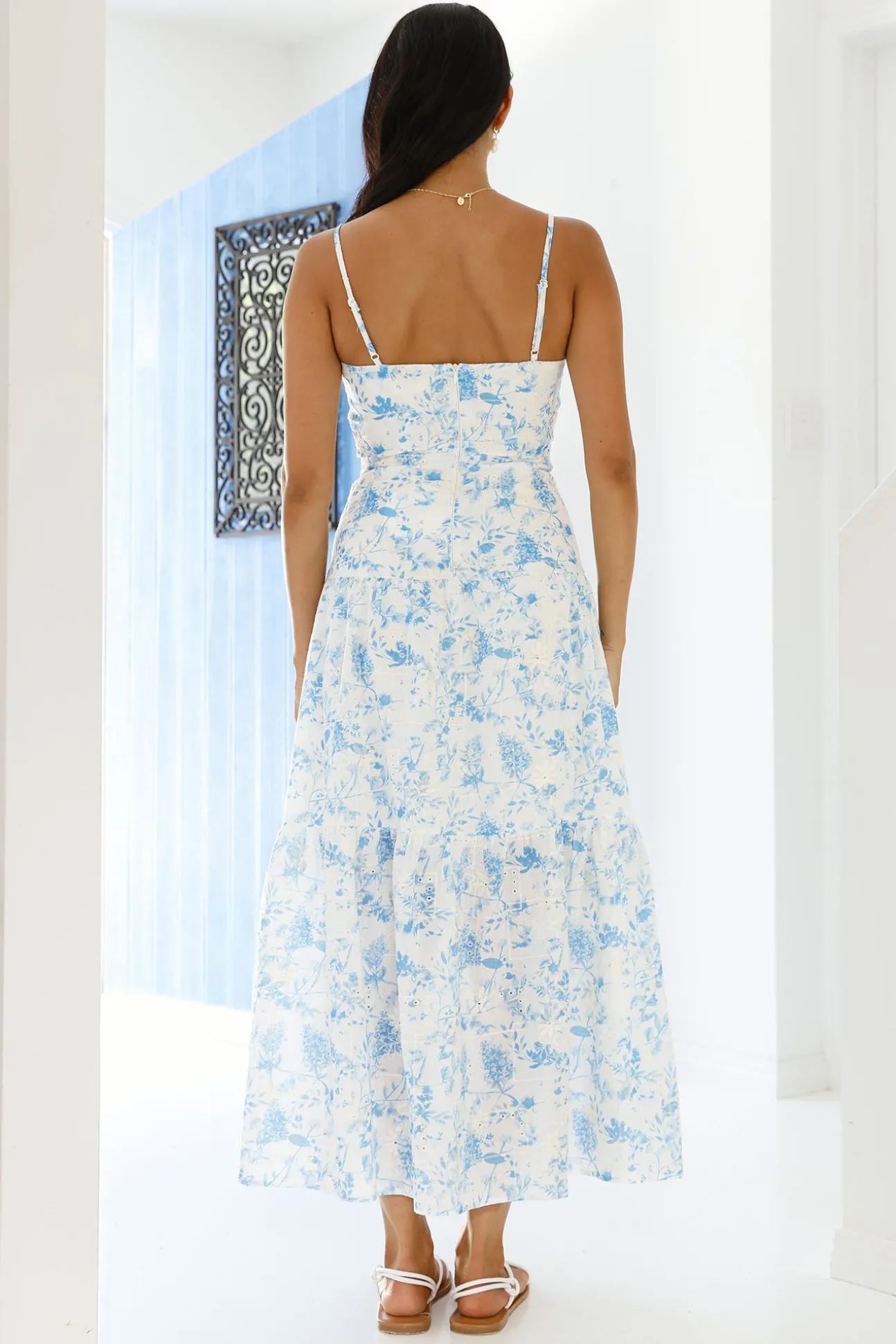 Drift into summer serenity with the Hidden Lagoon Maxi Dress Blue, a vision of effortless elegance. Featuring a delicate blue floral print on a crisp white base, this dreamy dress is designed with dainty spaghetti straps and a flattering fitted bodice that cascades into a flowy, tiered skirt.
