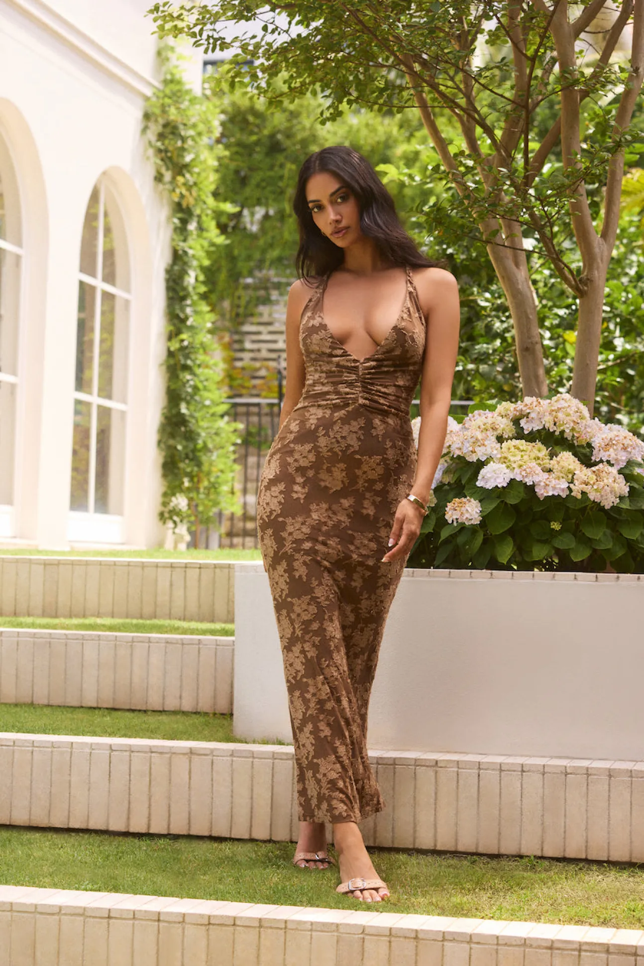 Turn heads in the . This sultry silhouette features a deep plunging neckline, halter tie straps, and ruched detailing at the bust for a flattering fit. Designed with an intricate floral lace overlay in warm golden hues, this dress exudes timeless elegance with a modern twist.